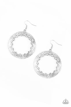 Glittery white rhinestones are encrusted haphazardly along the center of a glistening silver hoop radiating with scratched shimmer for a refined look. Earring attaches to a standard fishhook fitting.