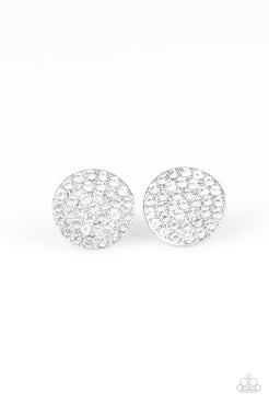 Countless white rhinestones are encrusted across the front of a beveled silver frame for a show-stopping look. Earring attaches to a standard post fitting.
