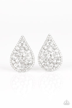 Radiating with glassy white rhinestones, oversized silver teardrops adorn the ear for a dramatic flair. Earring attaches to a standard post fitting.