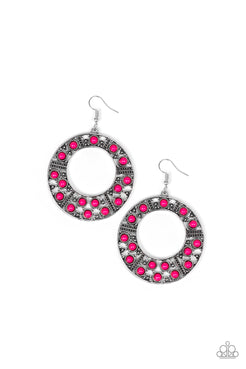 Flirtatious pink beads are sprinkled across a shimmery silver hoop radiating with dainty silver studs, creating a whimsical frame. Earring attaches to a standard fishhook fitting.
