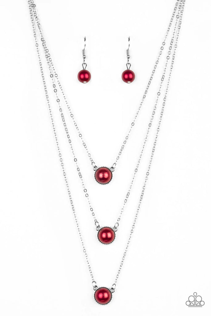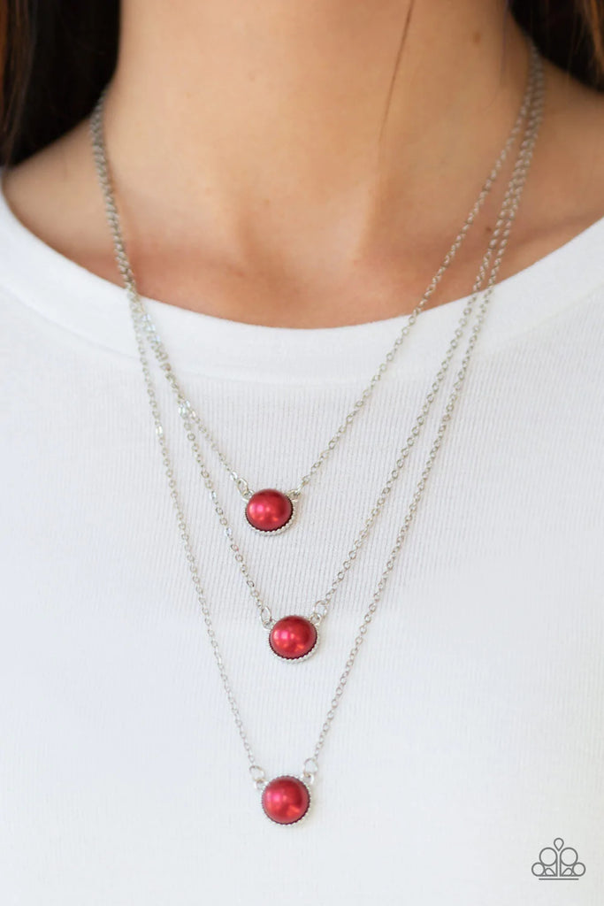 Three red pearl drop pendants layer down the chest in a refined fashion. Features an adjustable clasp closure.
