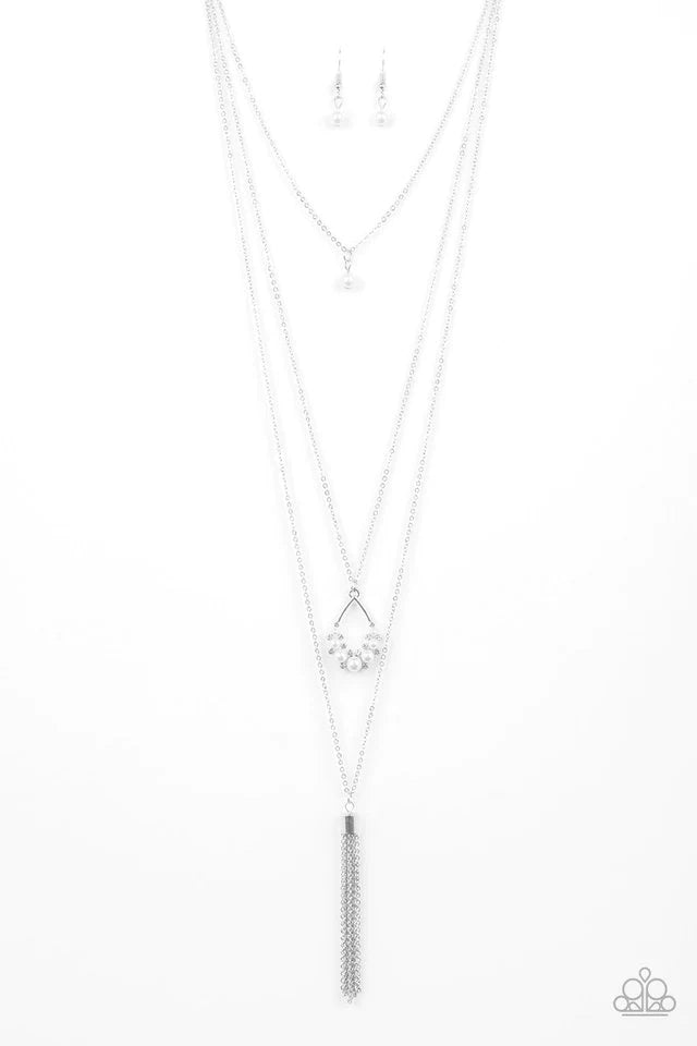 A solitaire white pearl swings from the uppermost chain, giving way to a teardrop pendant and shimmery silver chain tassel. Dainty white rhinestones and white pearls collect at the bottom of the centermost pendant for a glamorous finish. Features an adjustable clasp closure. Sold as one individual necklace. Includes one pair of matching earrings.
