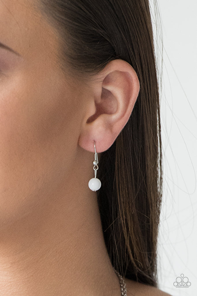 Neutral white and dainty silver beads trickle along two shimmery silver chains, creating colorful layers down the chest. A lobster clasp hangs from the bottom of the design to allow a name badge or other item to be attached. Features an adjustable clasp closure.