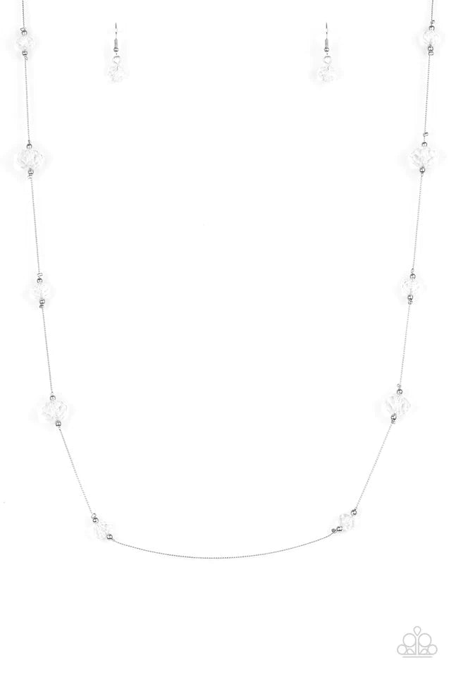 Infused with dainty silver accents, glittery white crystal-like beads trickle along a dainty silver chain across the chest for a refined look. Features an adjustable clasp closure. Sold as one individual necklace. Includes one pair of matching earrings.