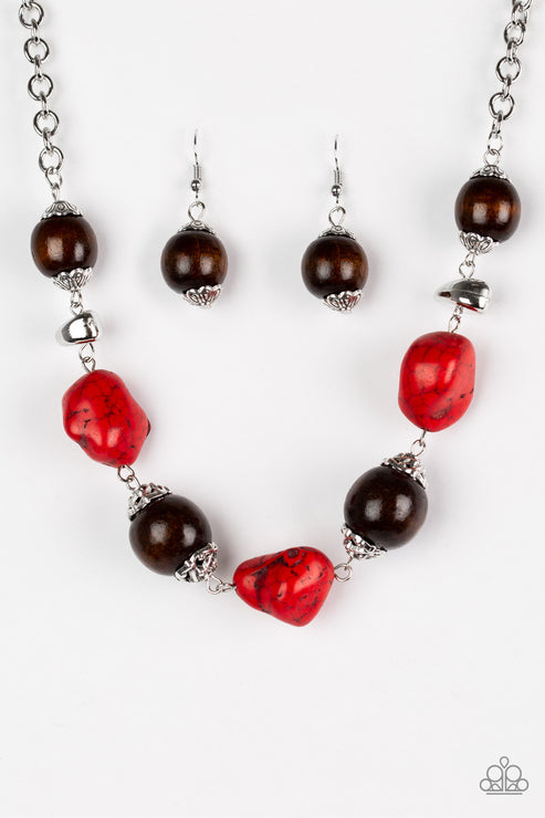 Infused with ornate silver accents, red stones and round wooden beads trickle along a shimmering silver chain, creating an artisanal statement piece that falls just below the collar. Features an adjustable clasp closure.