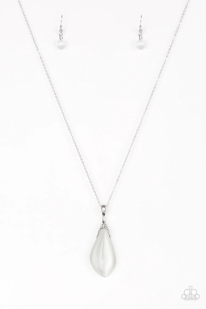 Infused with a white rhinestone encrusted fitting, an asymmetrical white moonstone swings from the bottom of an elongated silver chain for a whimsical look. Features an adjustable clasp closure.