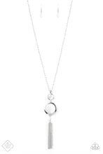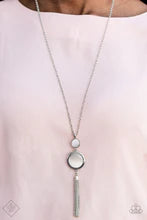 Swinging from the bottom of a glistening silver chain, glowing stacked moonstone pendants give way to a shimmery silver tassel for a refined look.
