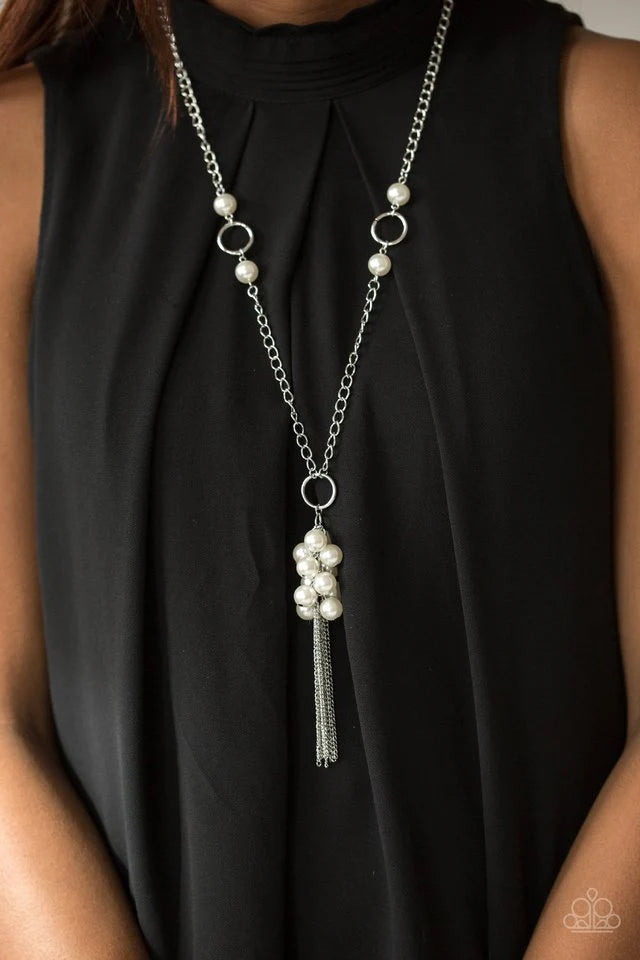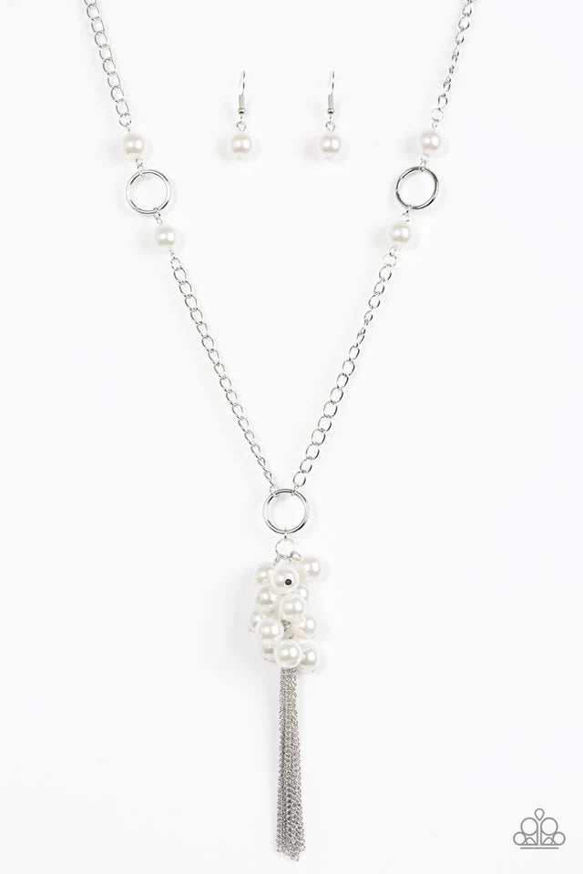 Pearly white beads and shimmery silver hoops give way to a clustered pearl tassel. Glistening silver chains stream from the bottom of the clustered pendant, adding flirty movement to the refined palette. Features an adjustable clasp closure. Sold as one individual necklace. Includes one pair of matching earrings.