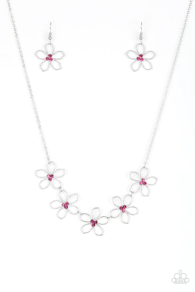 Dotted with radiant pink rhinestone centers, airy silver flowers link below the collar for a seasonal look. Features an adjustable clasp closure. Sold as one individual necklace. Includes one pair of matching earrings.