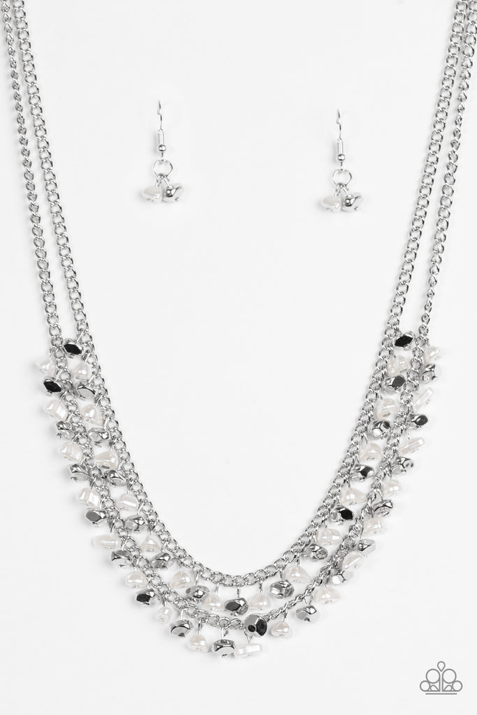 Faceted silver and pearly white beads swing from the bottom of two silver chains, creating a refined fringe below the collar. Features an adjustable clasp closure.