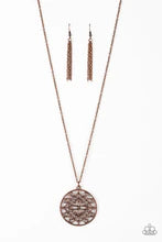 Featuring a whimsical mandala pattern, a glistening copper pendant swings from the bottom of a lengthened copper chain for a seasonal look. Features an adjustable clasp closure.