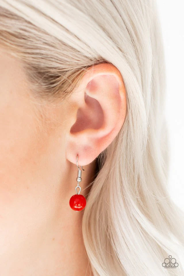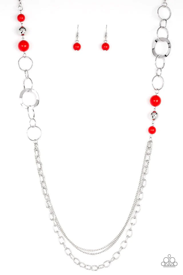 Fiery red beads, shiny silver beads, and glistening silver hoops give way to mismatched silver chains for a whimsical look. Features an adjustable clasp closure. Sold as one individual necklace. Includes one pair of matching earrings.