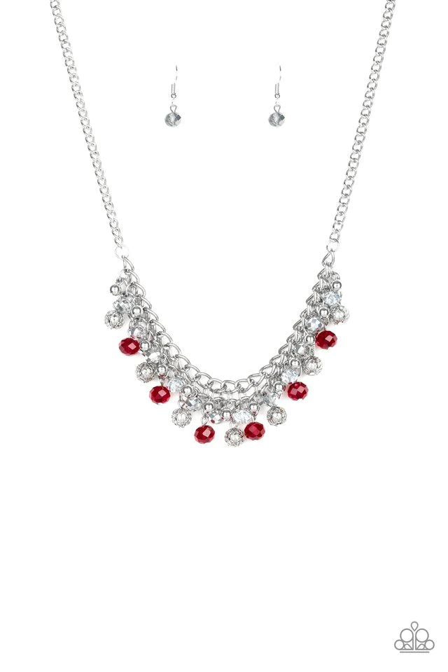 A collection of metallic net covered beads, shiny silver beads, and glittery red and metallic flecked crystal-like beads swing from the bottom of interlocking silver chains, creating a refined fringe below the collar. Features an adjustable clasp closure. Sold as one individual necklace. Includes one pair of matching earrings.