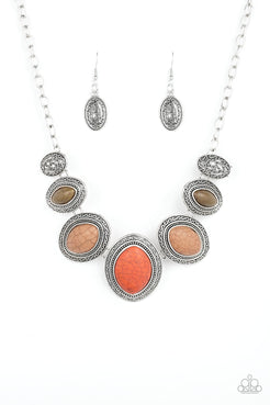 Gradually increasing in size near the center, earthy orange, green, and brown stones are pressed into textured silver frames below the collar for a tribal inspired look. Features an adjustable clasp closure.
