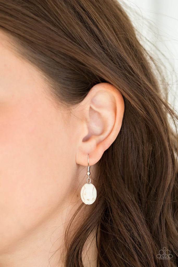A smooth white stone is pressed into a textured silver frame, creating a bold seasonal pendant below the collar. Features an adjustable clasp closure.