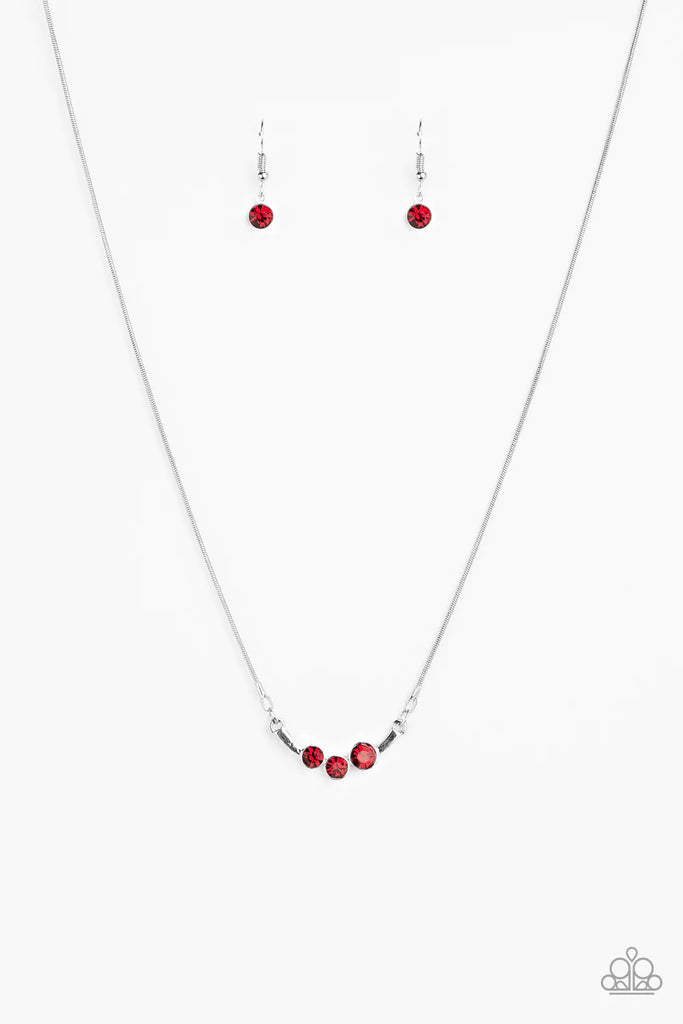 A trio of glittery red rhinestones are encrusted along a bowing silver bar, creating a stellar pendant below the collar. Features an adjustable clasp closure.