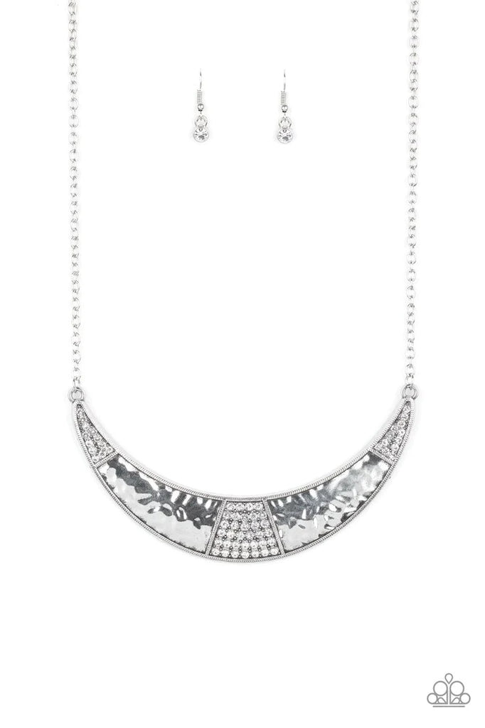 Featuring a shimmery hammered finish, a glistening silver half-moon plate is encrusted in sections of glassy white rhinestones, creating a blinding statement piece below the collar. Features an adjustable clasp closure.