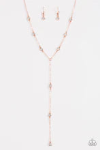 Pressed into sleek shiny copper frames, glittery white rhinestones trickle along a dainty shiny copper chain. Matching white rhinestones drip down an extended chain, creating an elegantly lengthened pendant. Features an adjustable clasp closure.
