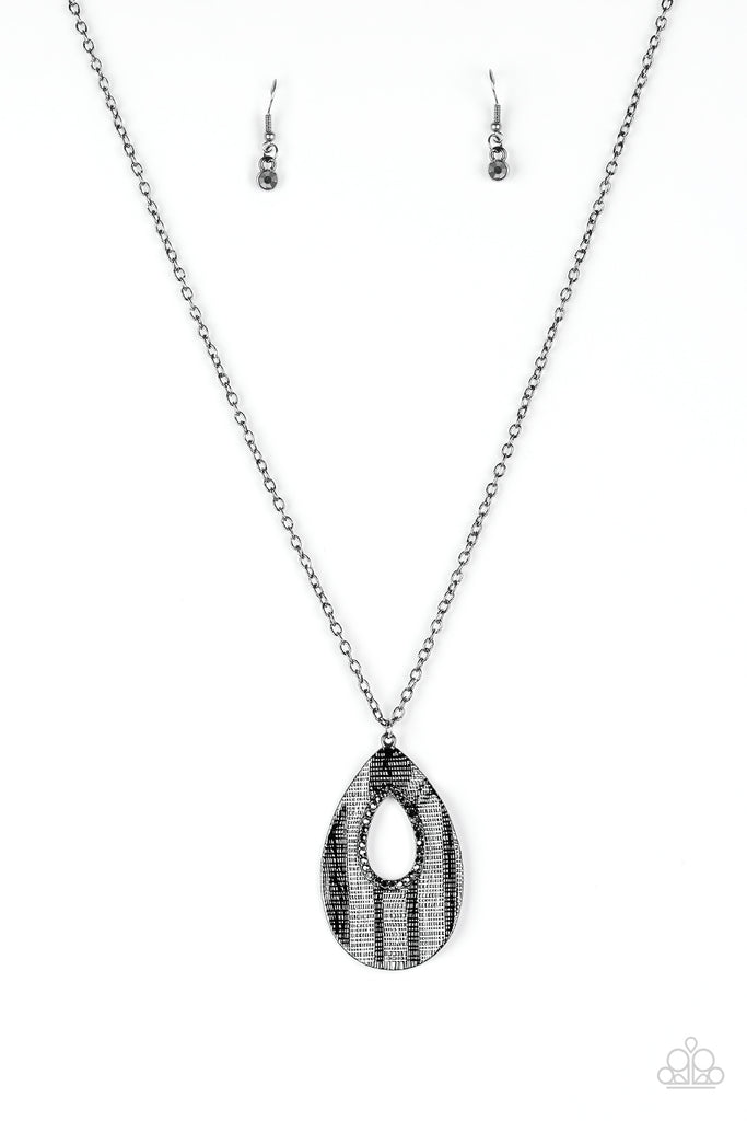 Embossed in a linear geometric pattern, a warped gunmetal teardrop swings from the bottom of a lengthened gunmetal chain. Glittery hematite rhinestones are encrusted around the center of the teardrop pendant for a sparkling finish. Features an adjustable clasp closure.