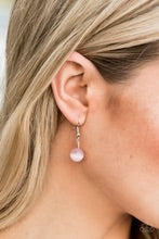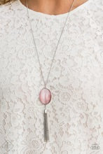 An oversized pink cat's eye stone frame gives way to a shimmery silver chain tassel, creating a whimsically stacked pendant at the bottom of a lengthened silver chain. Features an adjustable clasp closure.
