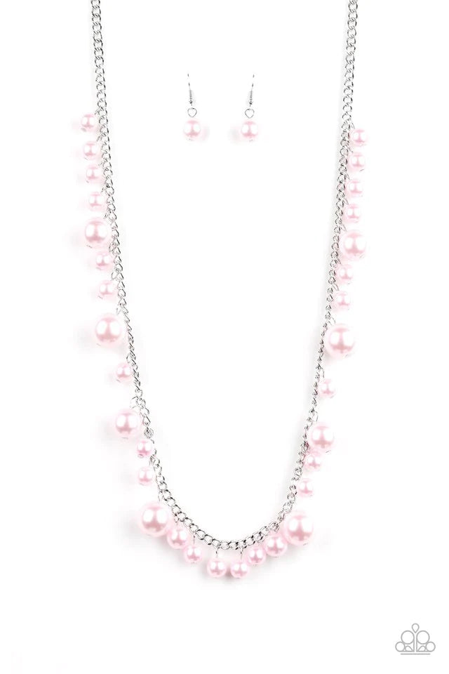Varying in size, bubbly pink pearls trickle along a shimmery silver chain for a refined look. Features an adjustable clasp closure. Sold as one individual necklace. Includes one pair of matching earrings.