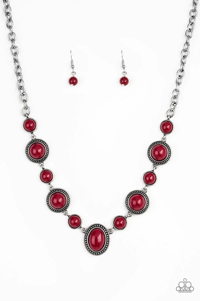 Featuring smooth and studded silver frames, rich red beads link below the collar in a seasonal fashion. Features an adjustable clasp closure.