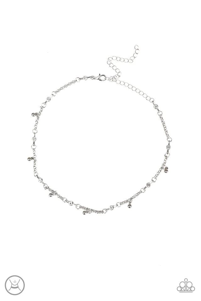 Featuring sleek fittings, dainty white rhinestones link with sections of shimmery silver chain around the neck. Shiny silver beads dangle from the chain for a flirtatious finish. Features an adjustable clasp closure. Sold as one individual choker necklace. Includes one pair of matching earrings.