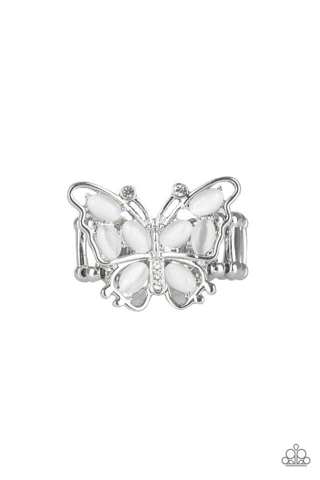 Dotted with glittery white rhinestones, a white moonstone encrusted butterfly perches atop the finger for a whimsical flair. Features a stretchy band for a flexible fit.
