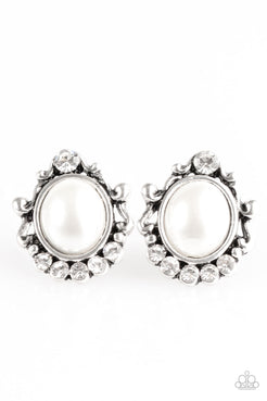 A pearly white bead is pressed into the center of a dainty silver frame. Glittery white rhinestones dance around the refined frame for a timeless finish. Earring attaches to a standard post fitting.